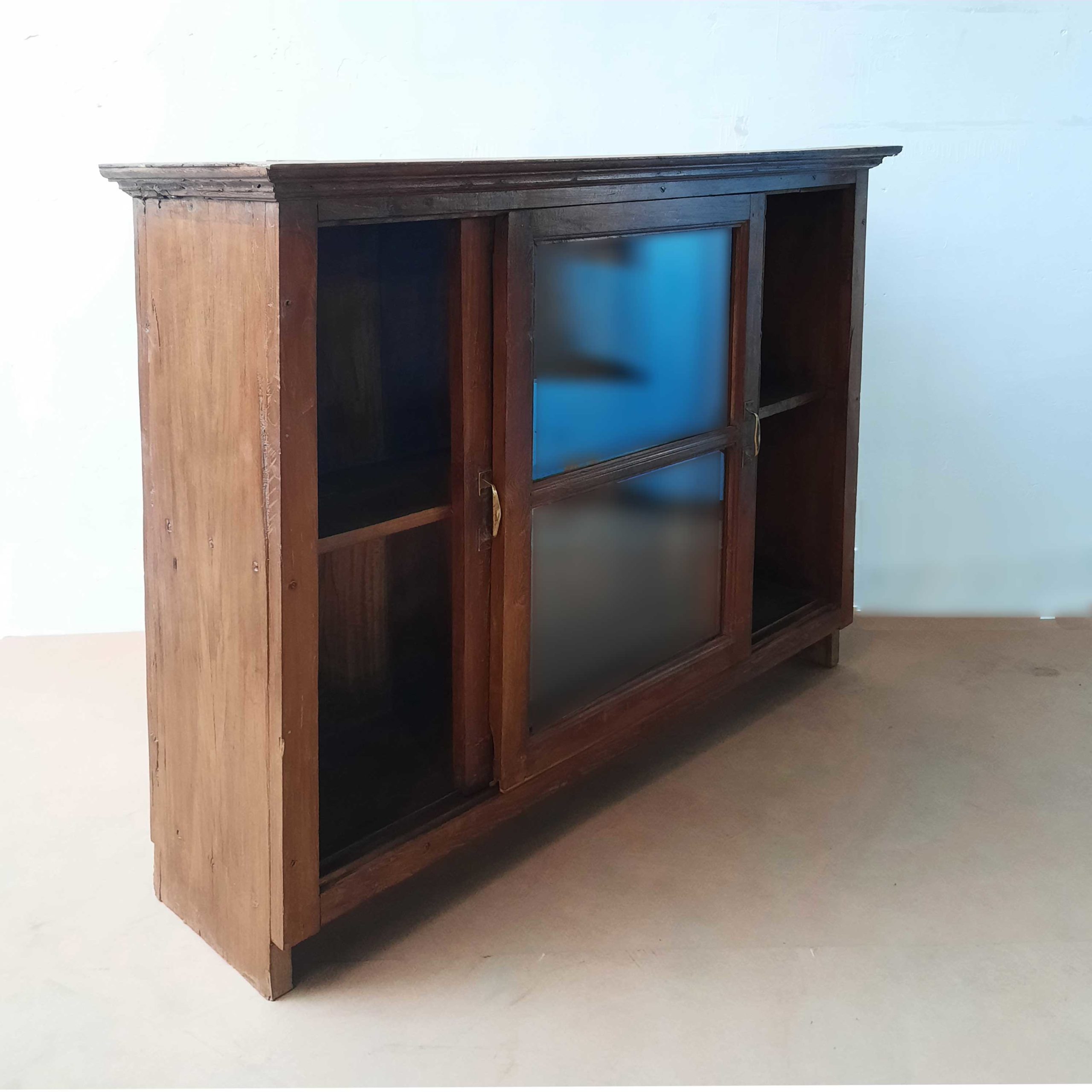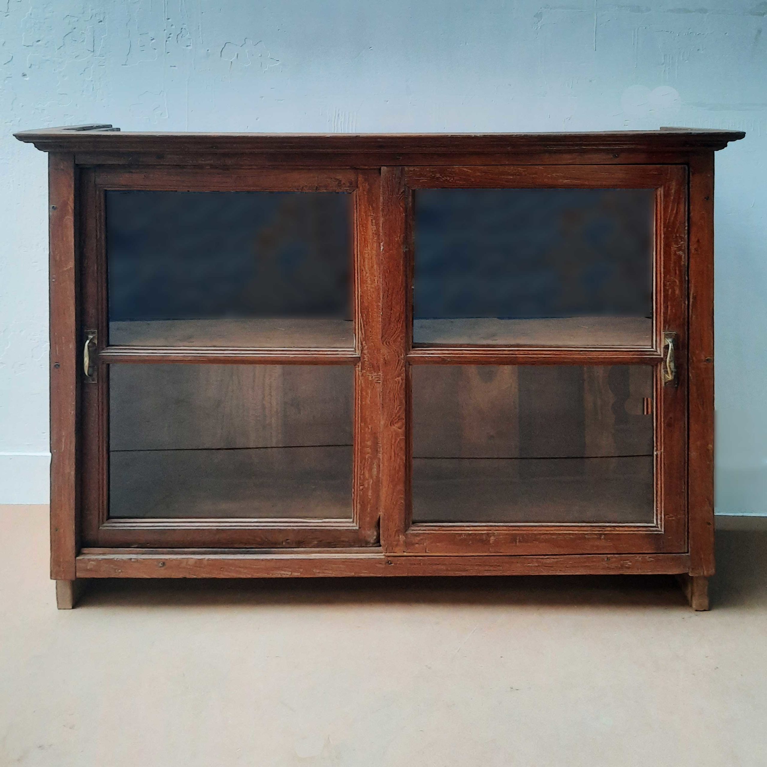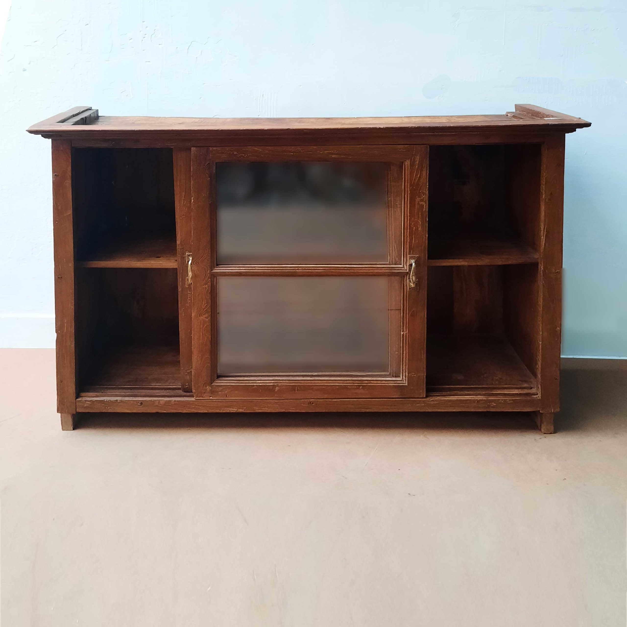 Aparador con puertas correderas. Pieza vintage elaborada en madera maciza que se presenta con algúnn signo del paso del tiempo y con caracter. Un aparador muy funcional y estético con un sobre bandeja que invita a seguir decorando, quizás como mueble bar, con plantas, jarrones o cuadros apoyados...