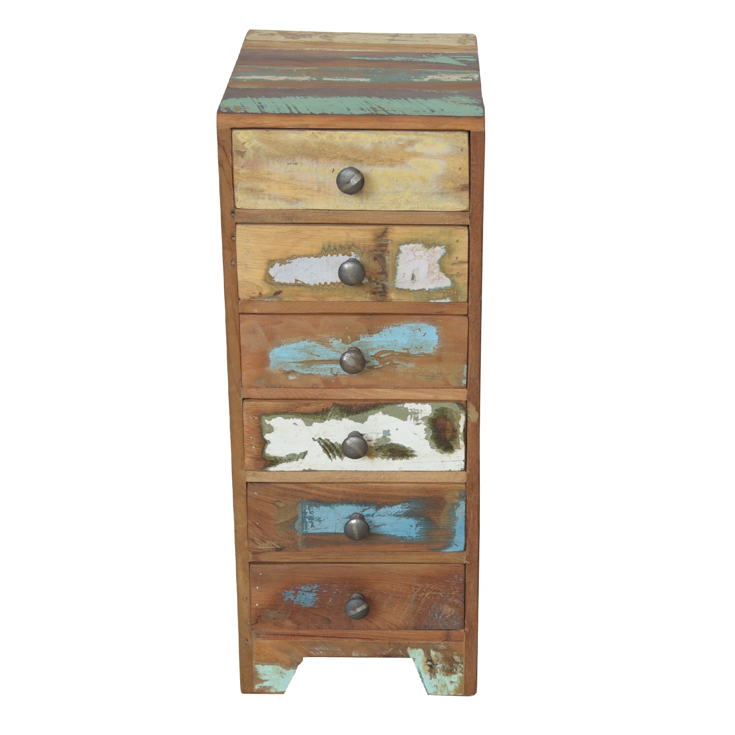 Cajonera alta de 6 cajones hecha de madera maciza reciclada. Cada pieza presenta los colores originales y los signos del desgaste por lo que cada cajonera es única.