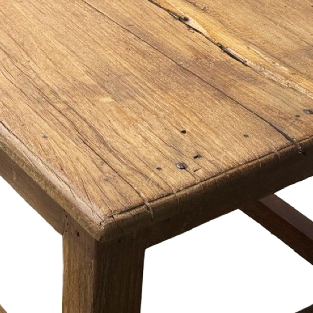 Mesa de centro Puraana, una pieza vintage, elaborada en madera maciza, muestra signos del paso del tiempo que le dan empaque y calidez.