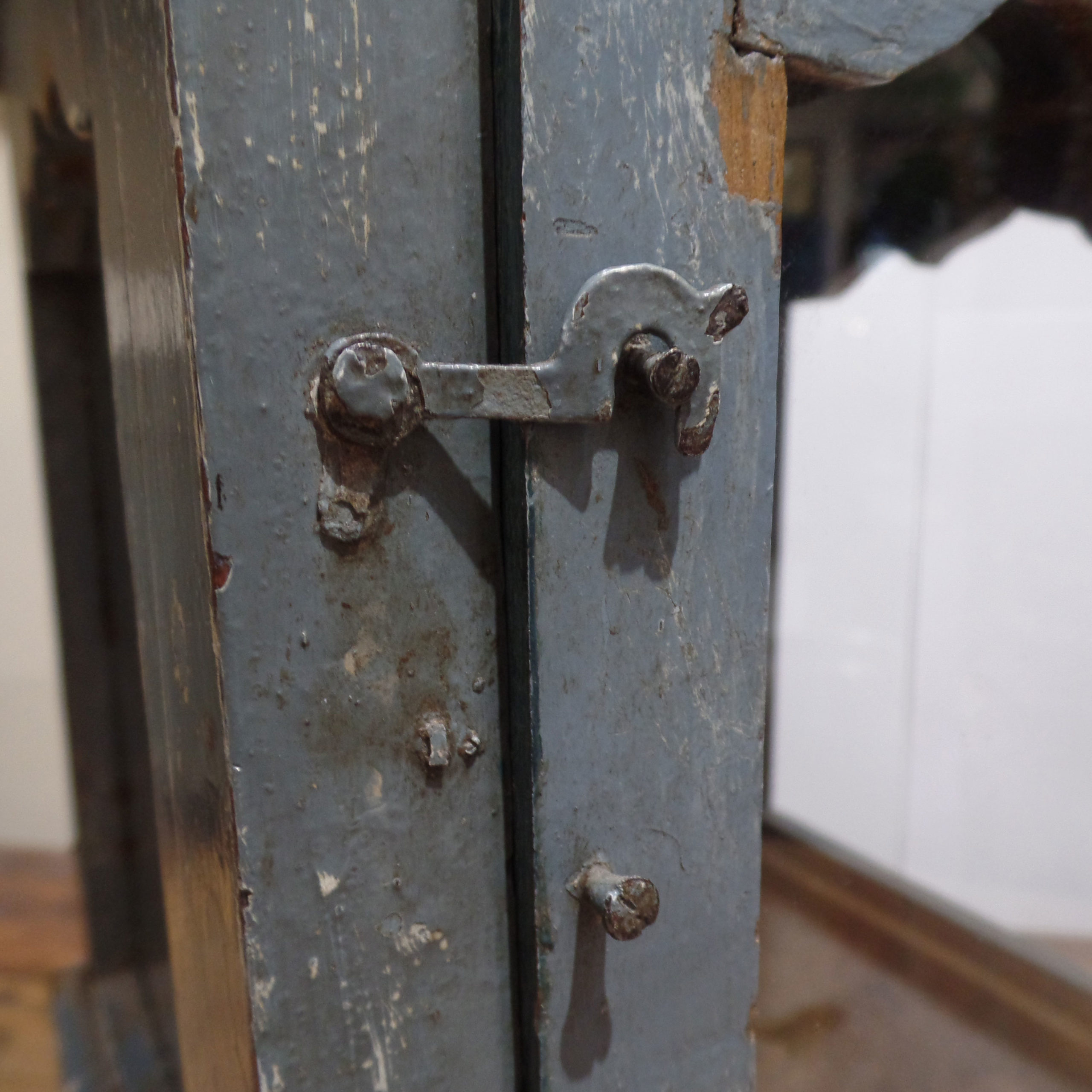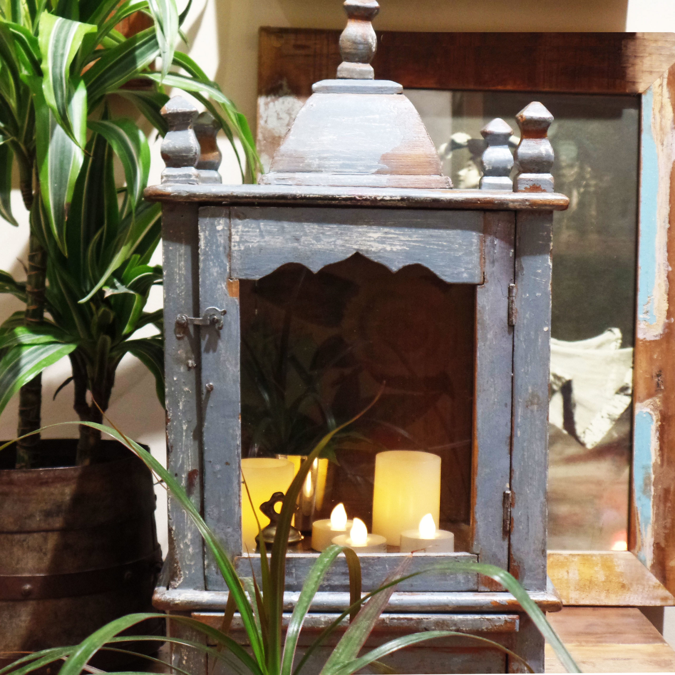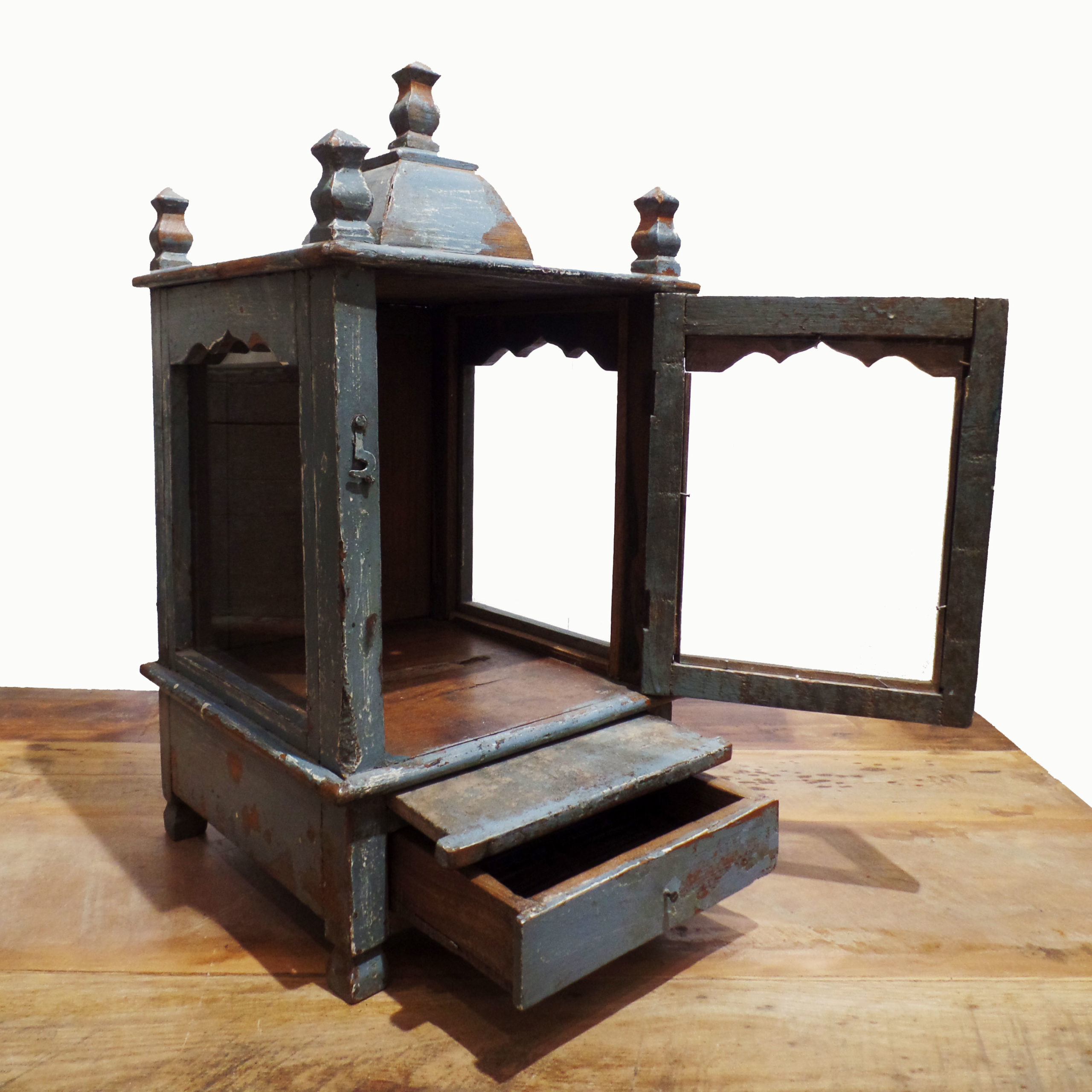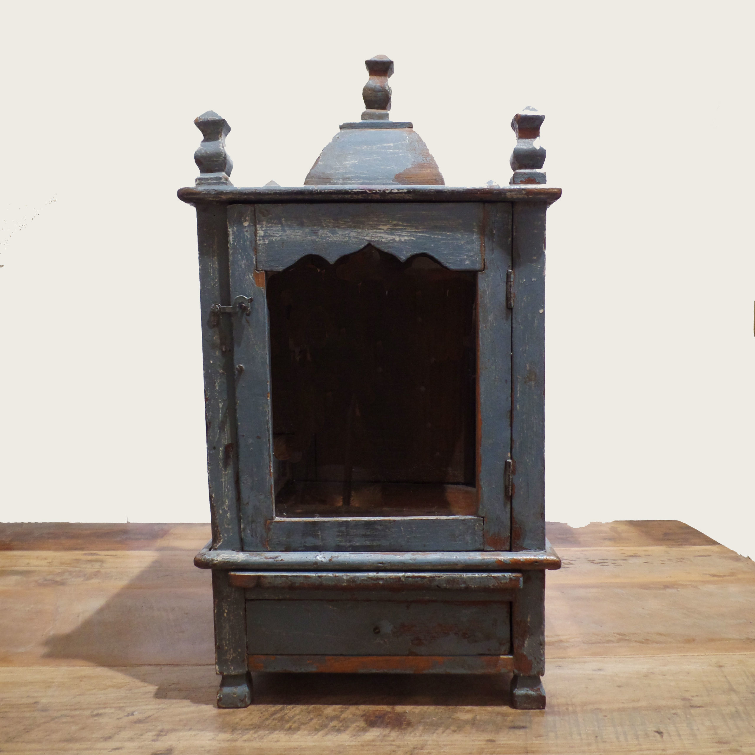 Altar vintage en azul grisáceo con un cajón que en su día guardo incienso y una tablita para apoyar flores. Todo pensado para su funcionalidad, adorar!
