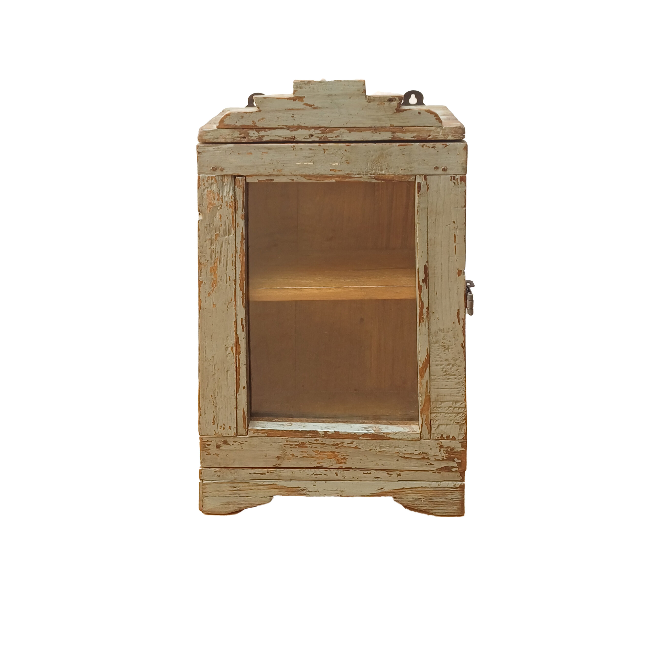 Vitrina Chadhaee, una pieza vintage, elaborada en madera y pintada en un verde grisáceo que presenta algún signo del paso del tiempo y que la hace entrañable.
