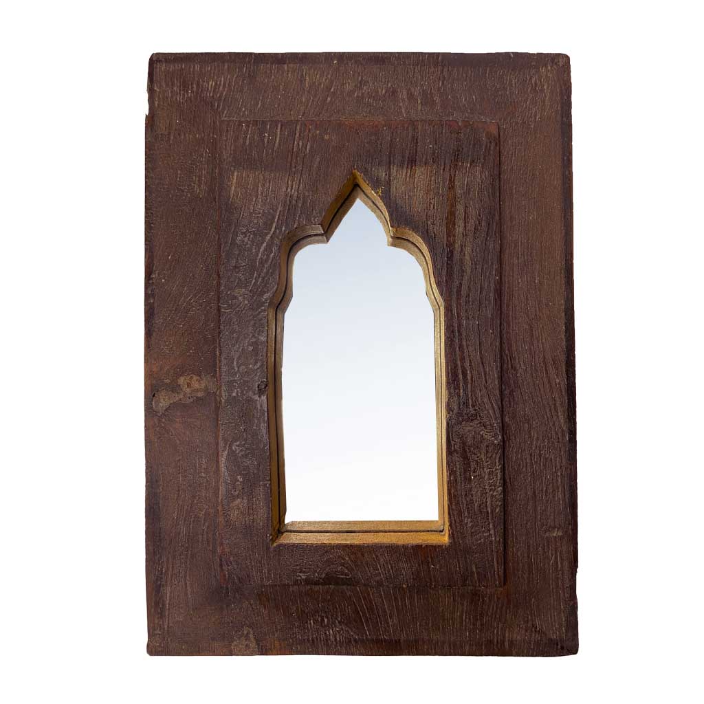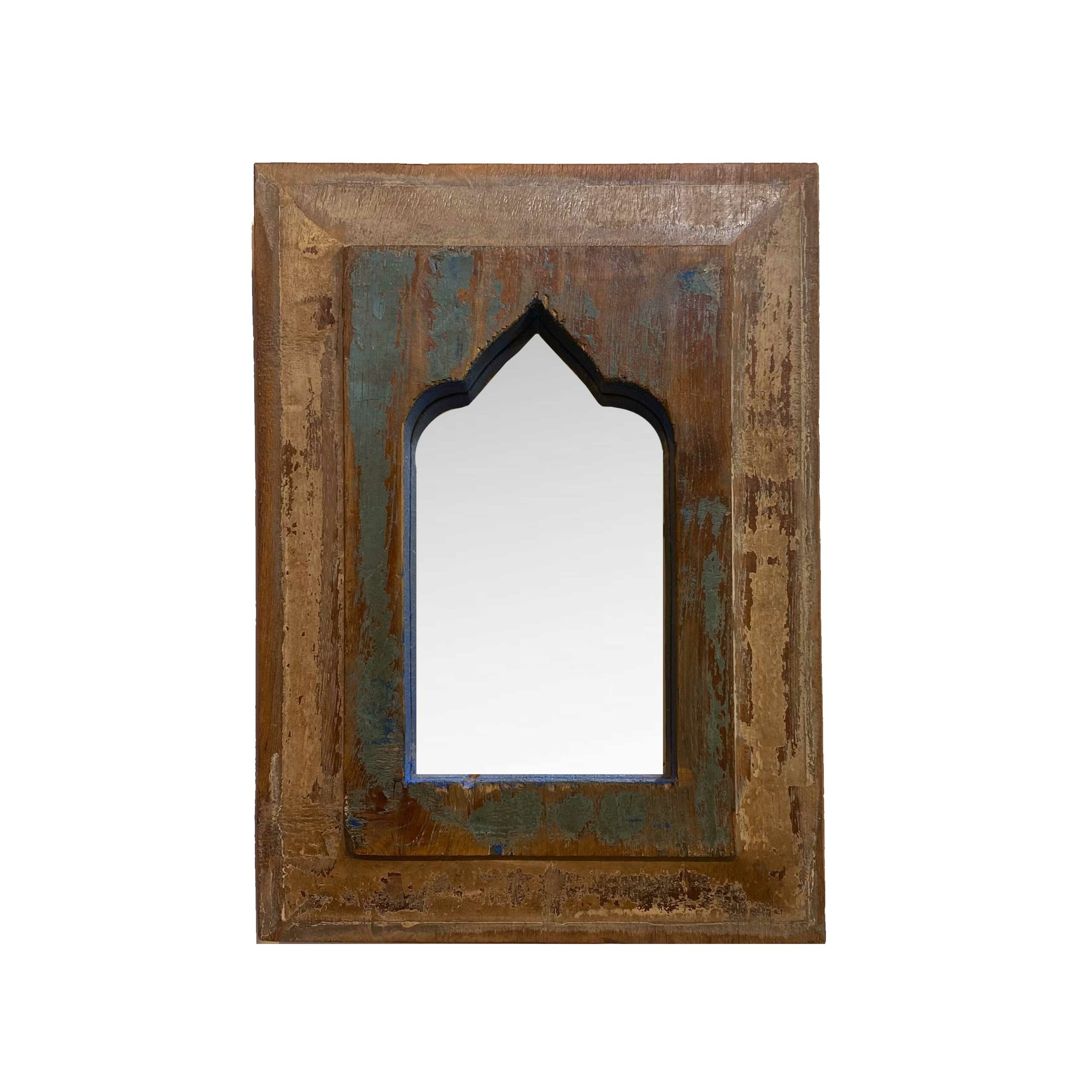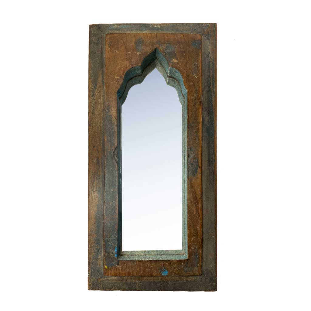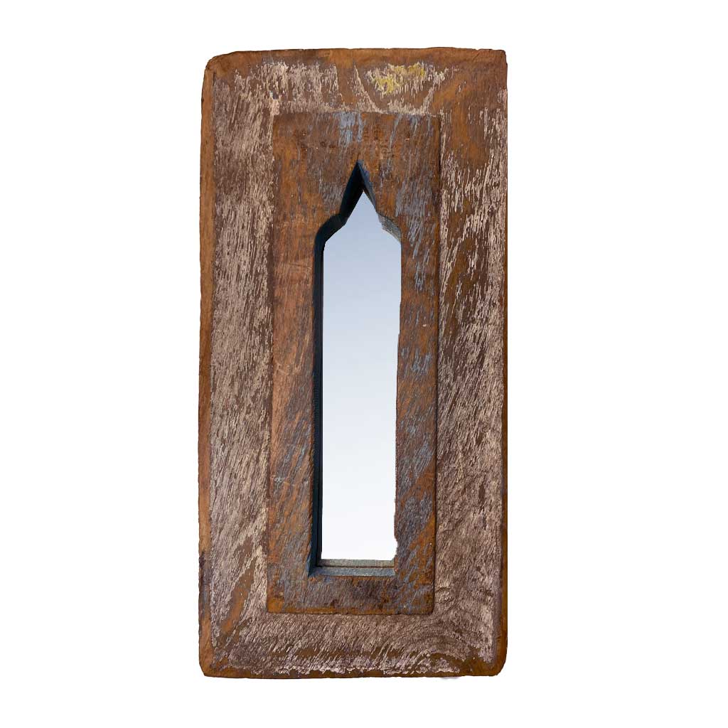 Espejo Mehrab de tamaño mediano, elaborado con madera maciza procedente de antiguos paneles de puertas trabajados con tallas y molduras.