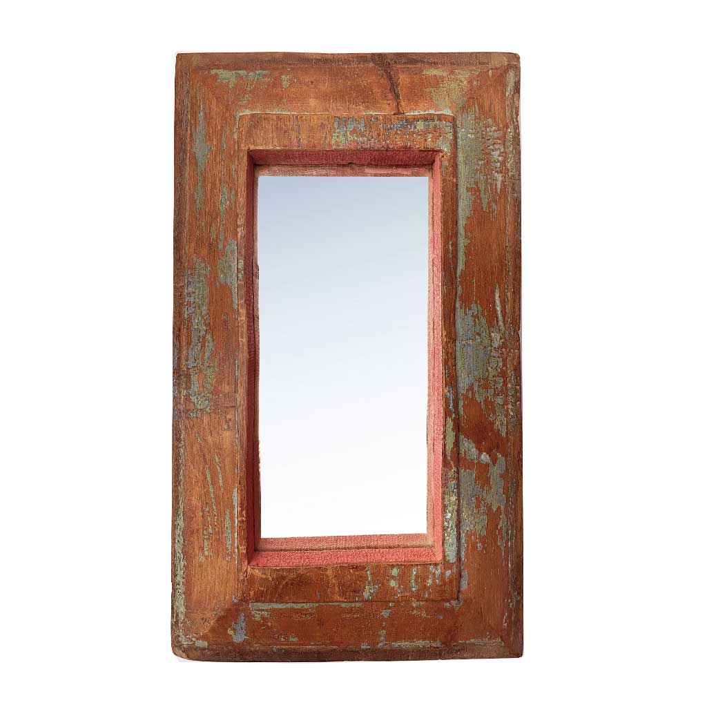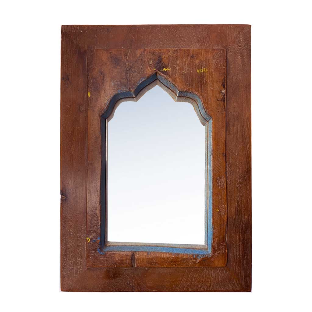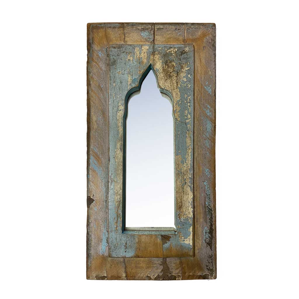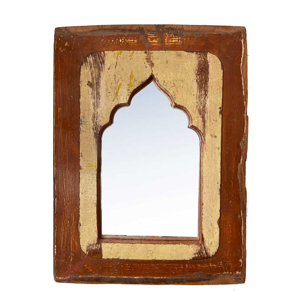 Espejo Mehrab de tamaño mediano, elaborado con madera maciza procedente de antiguos paneles de puertas trabajados con tallas y molduras.
