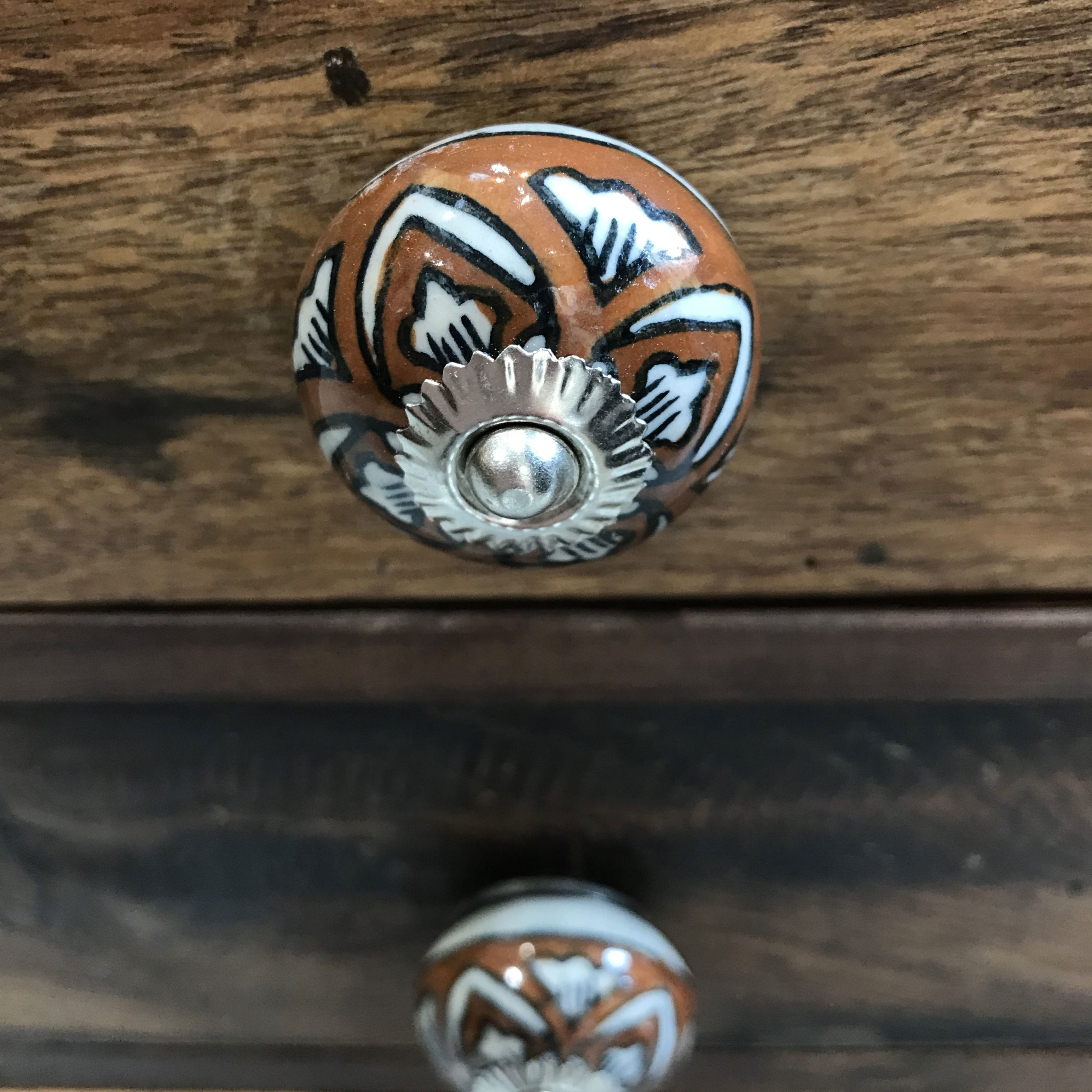Pomos cerámica marrón sobre blanco roto con pincelas en negro creando bellos dibujos.