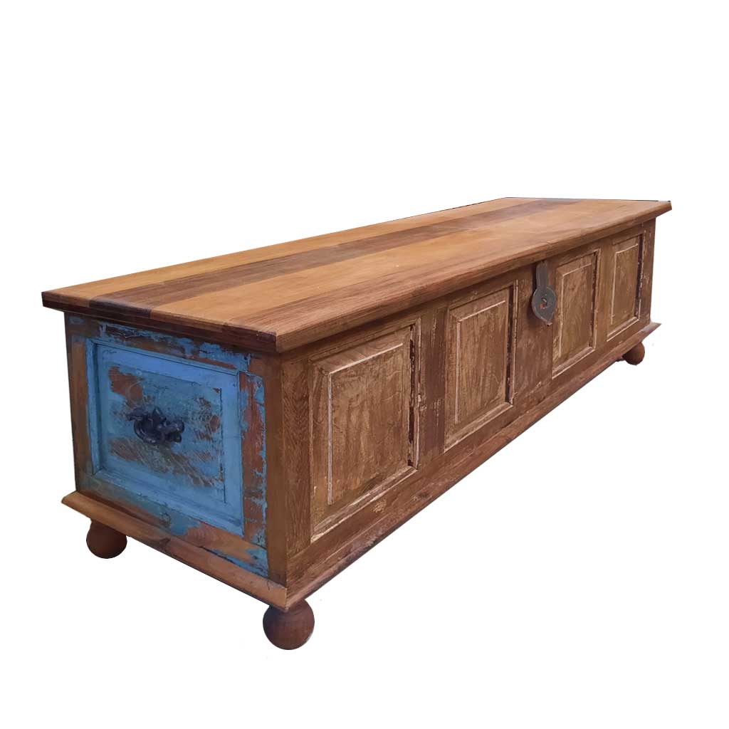 Baúl elaborado con antiguos porticones que mantienen los herrajes originales y madera tropical reciclada. Se presenta como un mueble decorativo a la vez que muy funcional ya que sus medidas dan la posibilidad de ser utilizado como banco, mesa de centro o como un confortable zapatero en un recibidor. Un mueble que nos acompañará siempre por su multitud de funciones.