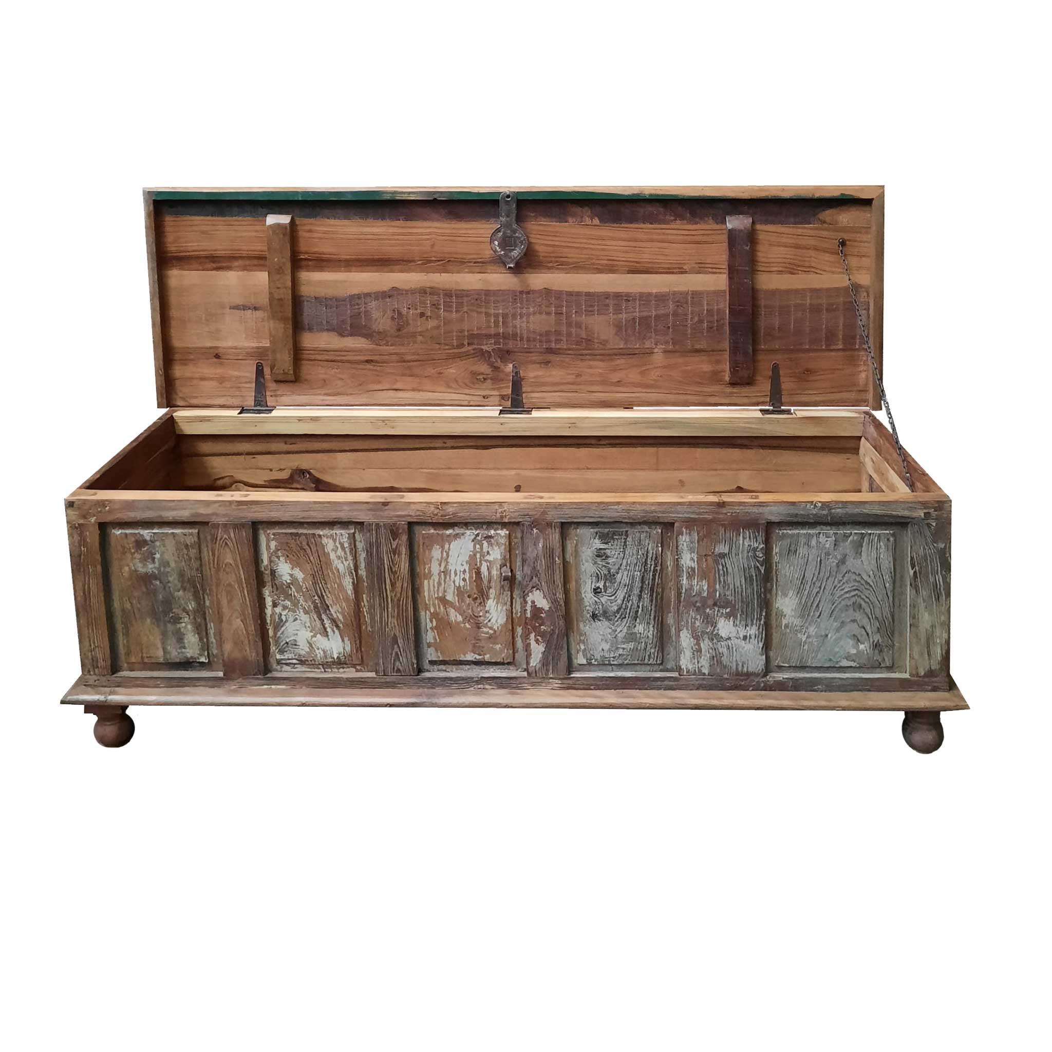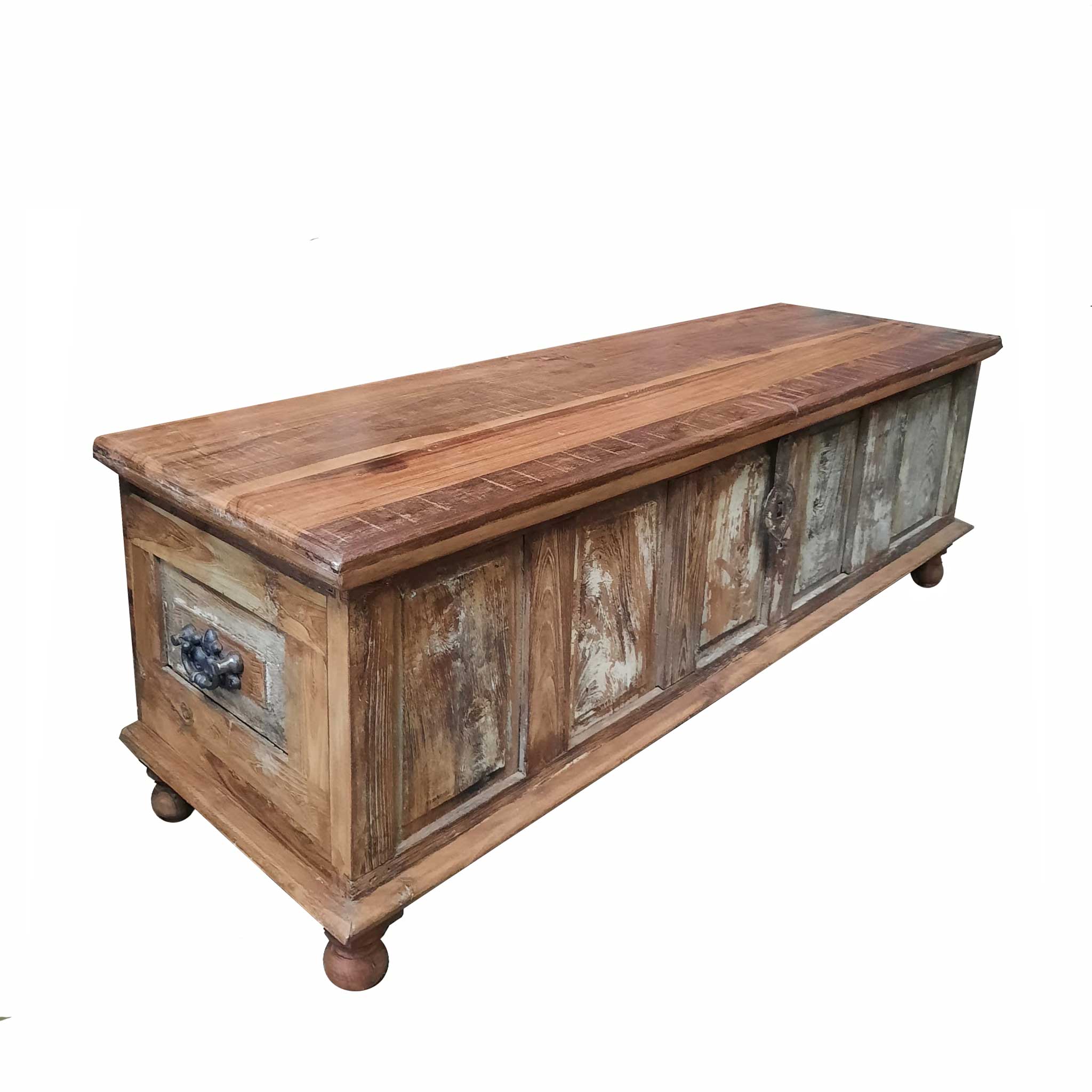 Baúl elaborado con antiguos porticones que mantienen los herrajes originales y madera tropical reciclada. Se presenta como un mueble decorativo a la vez que muy funcional ya que sus medidas dan la posibilidad de ser utilizado como banco, mesa de centro o como un confortable zapatero en un recibidor. Un mueble que nos acompañará siempre por su multitud de funciones.